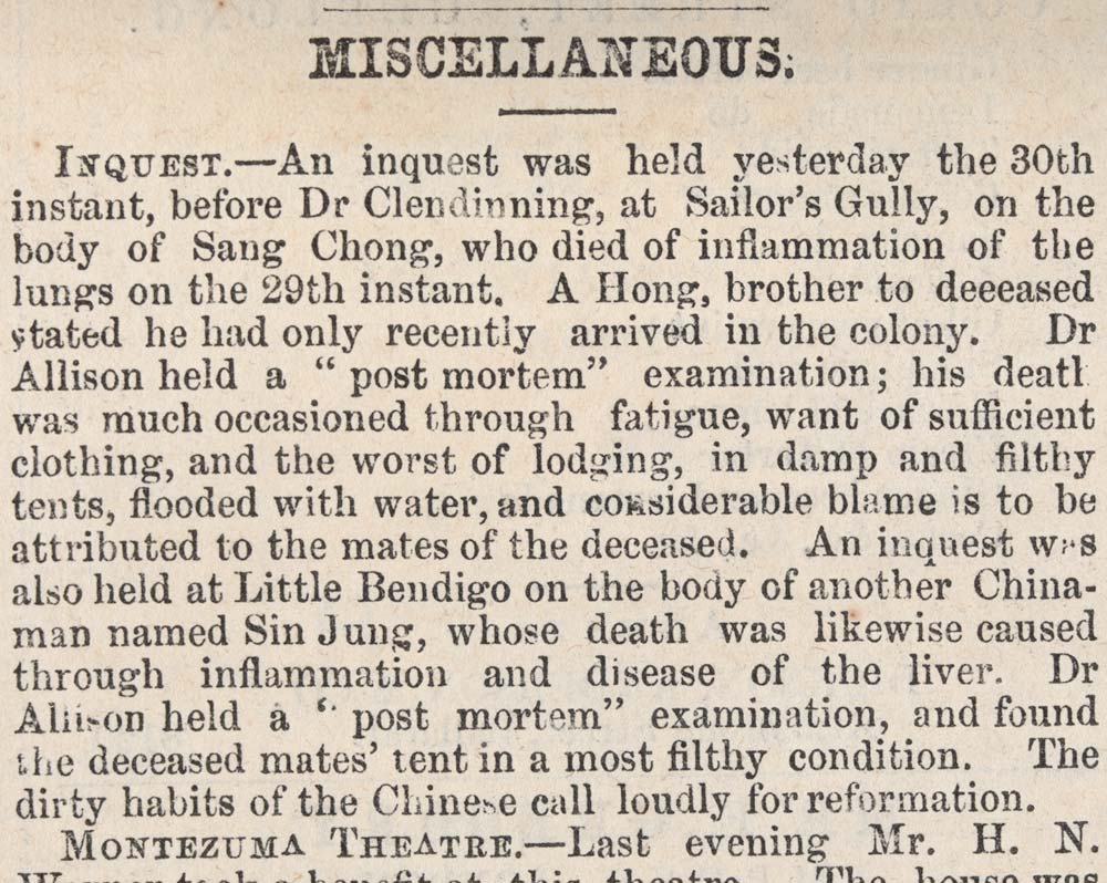 The disparaging tone of this news article provides an indication of the European sentiment towards the Chinese miners on the goldfields.