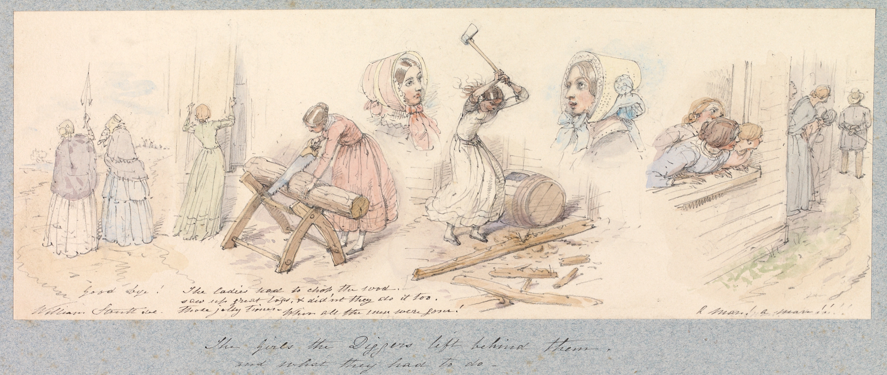 Strutt's painting illustrates the unusual predicament that the women of Melbourne found themselves in shortly after gold was discovered in October 1851. Without men around to perform traditional male tasks, the women filled their shoes and chopped wood, fetched water and mended houses as required.