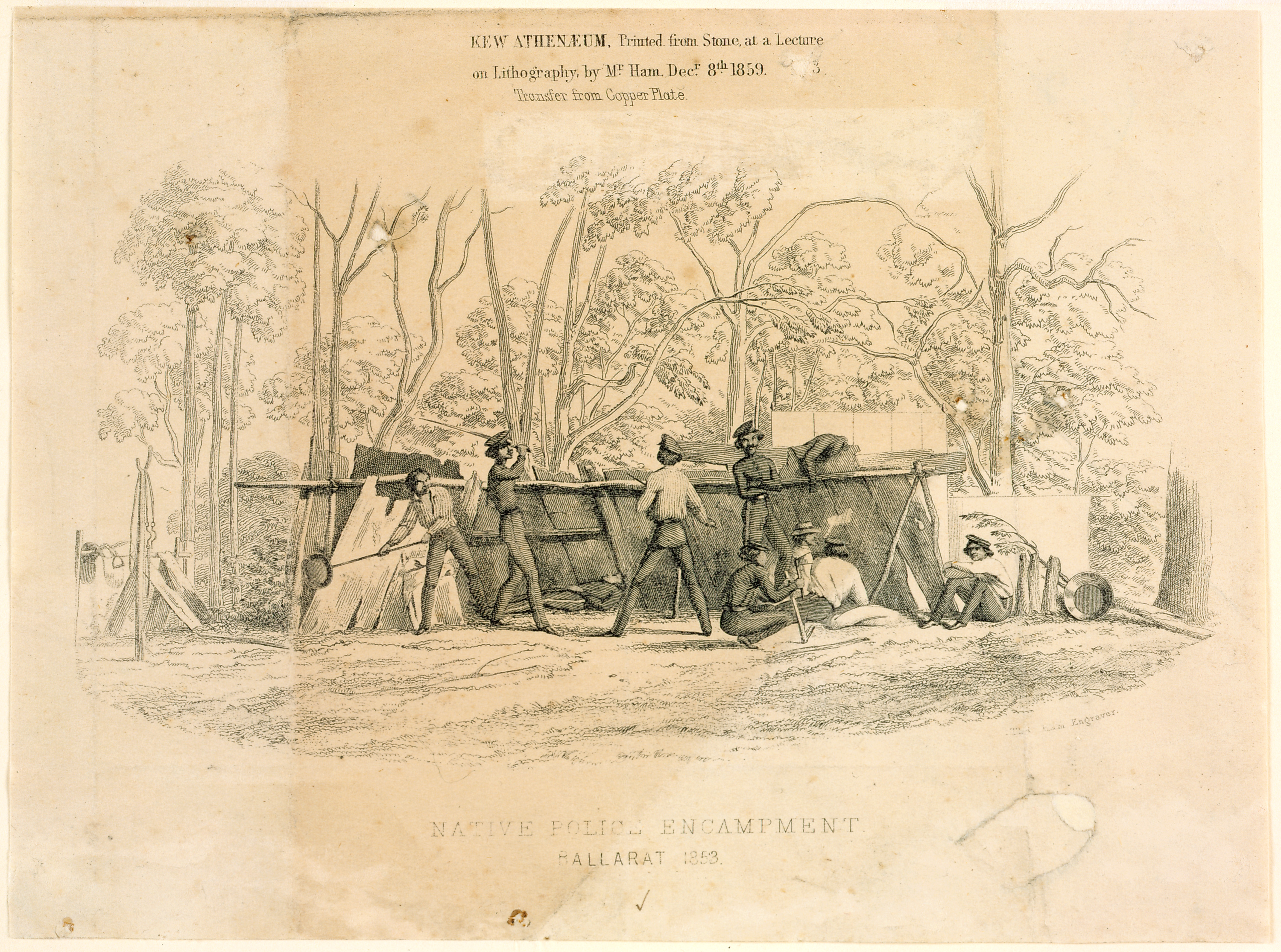 This engraving shows a Native Police encampment with a split bark shelter. The officers are relaxing off-duty.