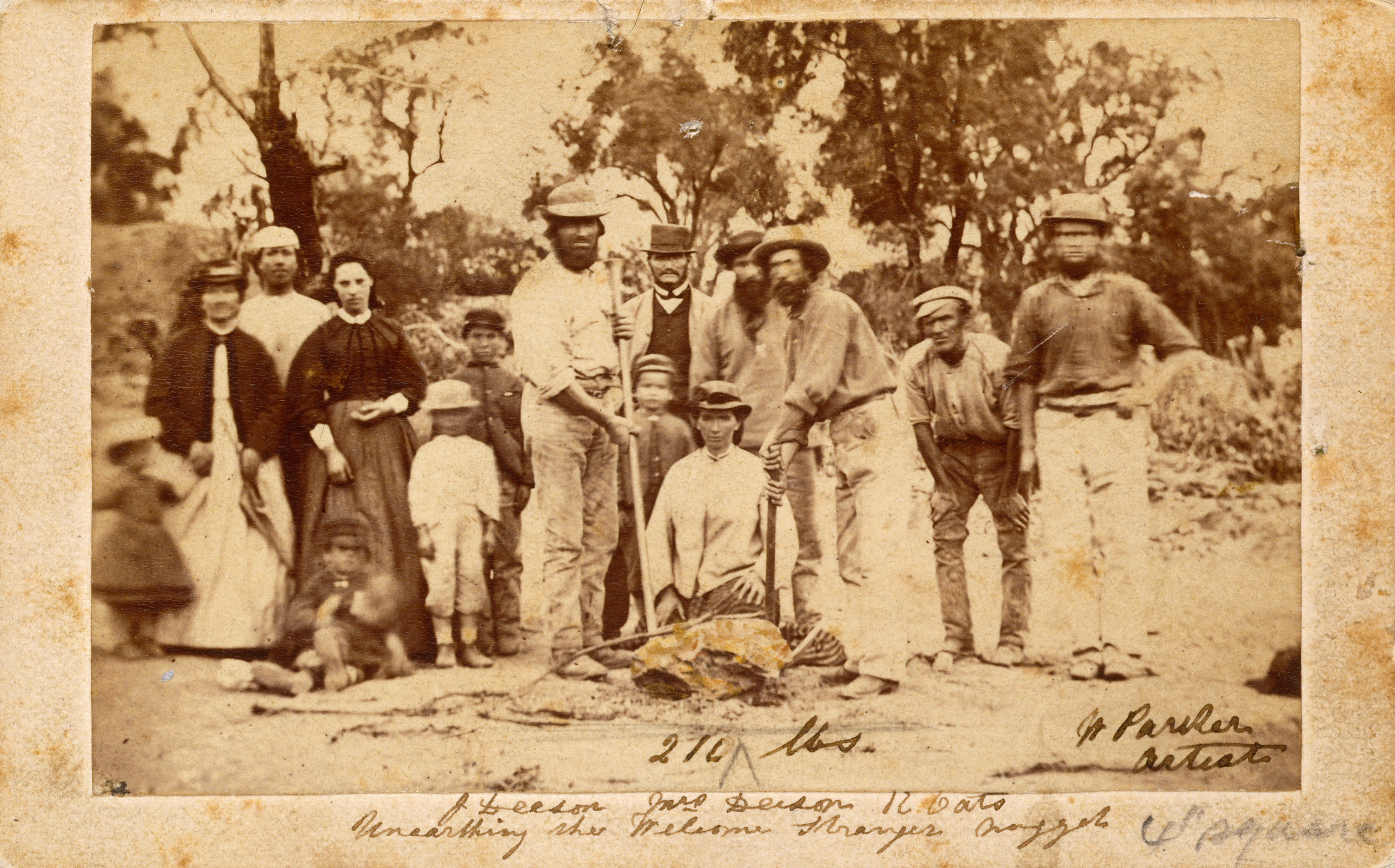 Miners and their wives posing with the finders of the nugget, Richard Oates, John Deason and his wife. The Welcome Stranger Nugget was discovered on 5 February 1869.
