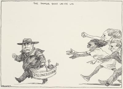 This cartoon comments on the Howard government's policy on reconciliation and the Stolen Generations by showing Howard running away from three people, including an Aboriginal woman. The title, Things that unite us, may relate to communities across Australia coming out in favour of the reconciliation movement in opposition against Howard's refusal to say ‘sorry'.