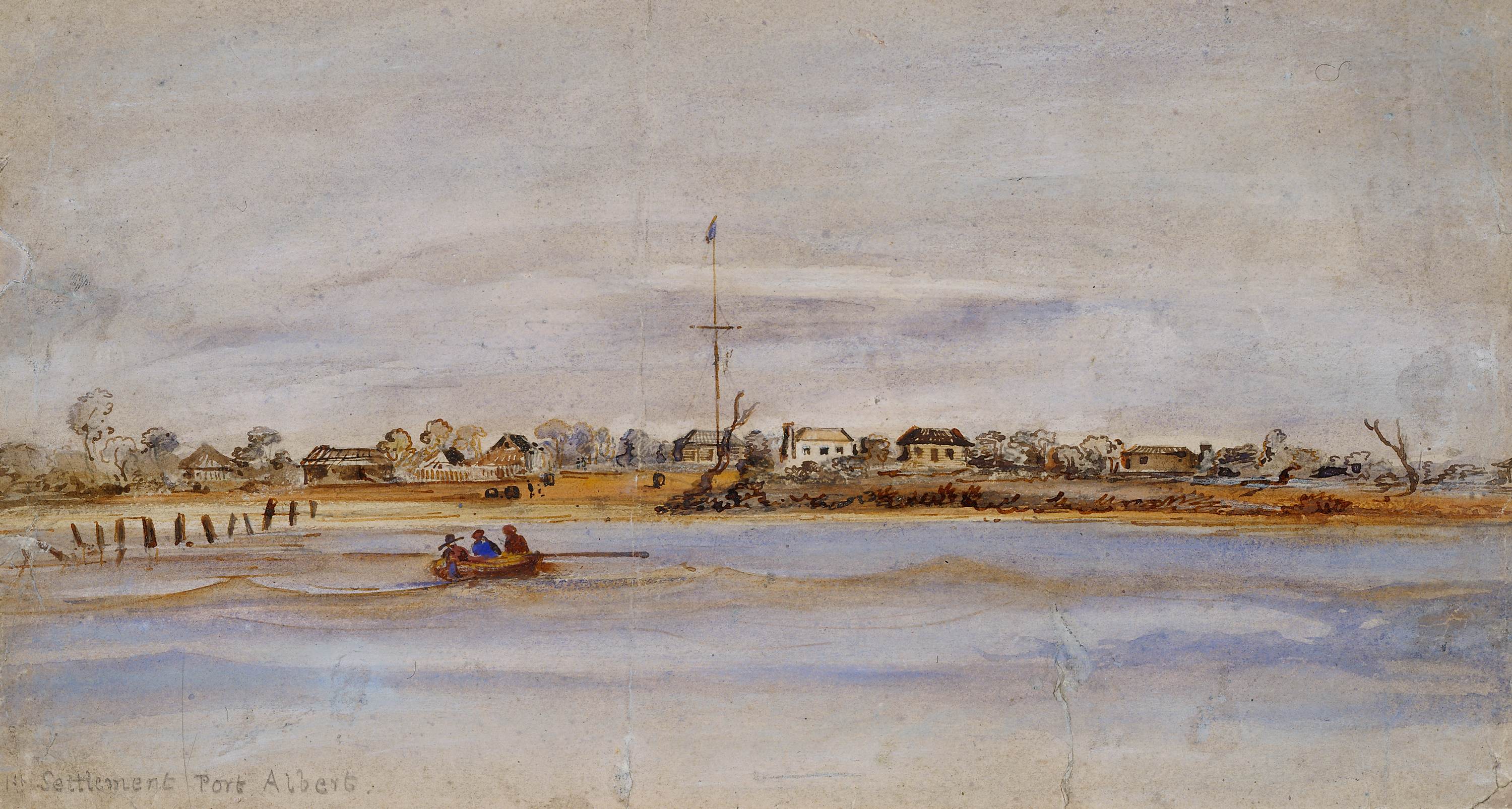 A small watercolour of the early days of the Gipps Land Company's settlement at Port Albert, painted by the surveyor.