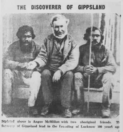Angus McMillan sitting with two Aboriginal men. This image was used as a postcard.