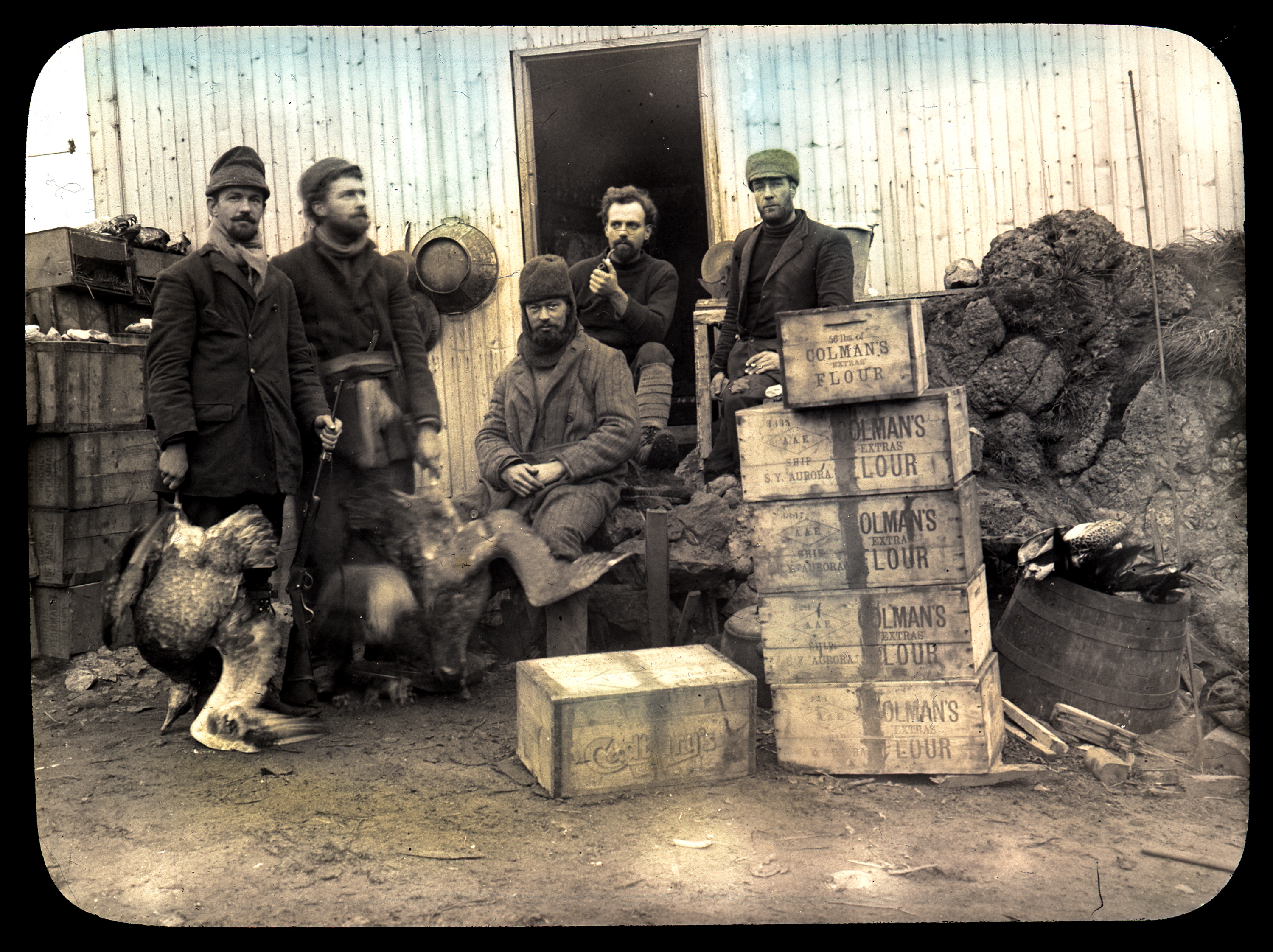 Five men, Douglas Mawson seated in centre, with supplies of flour and birds, shot to act as a supplement to their rations.