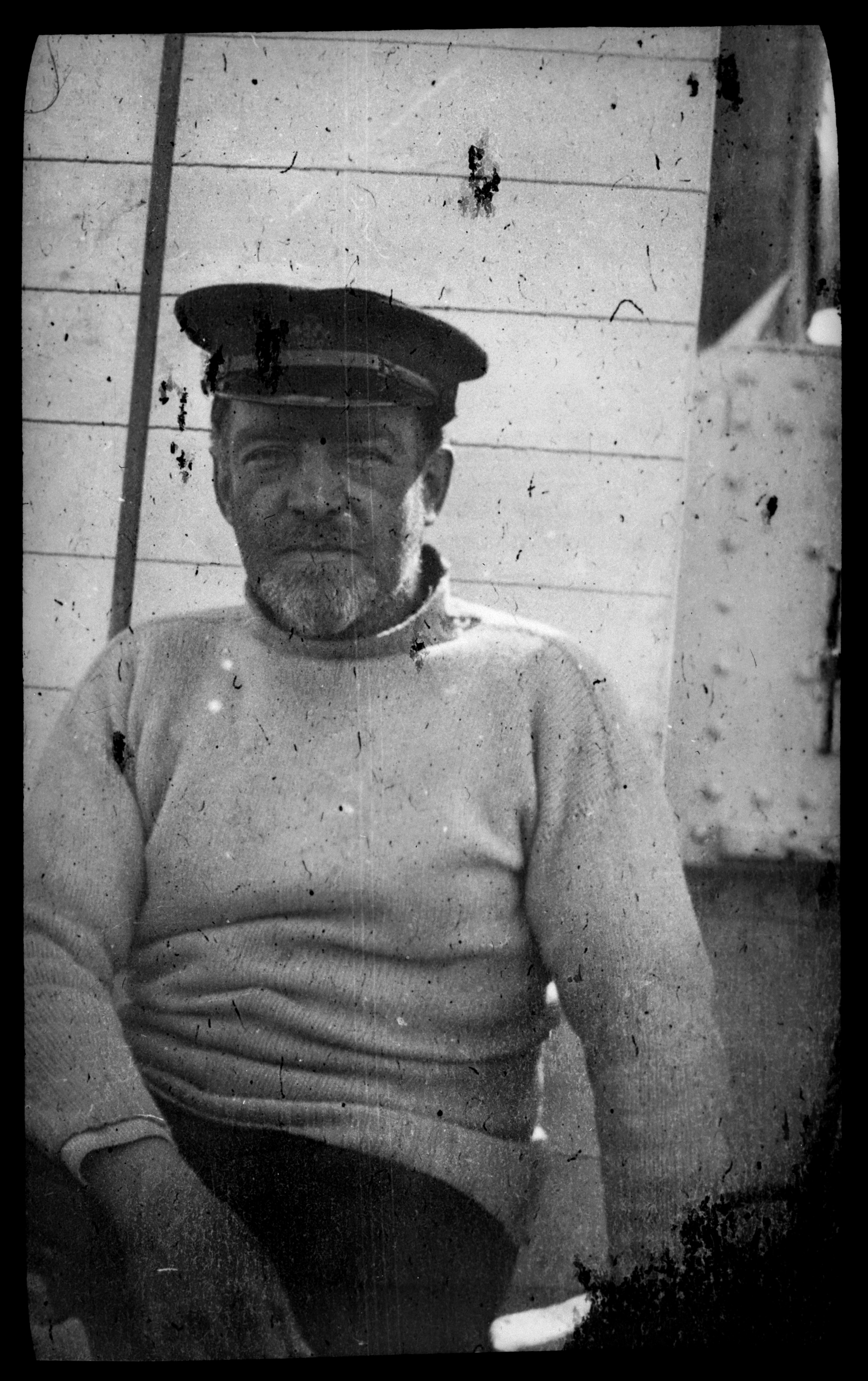 Sir Ernest Shackleton sitting on board the Antarctic exploration vessel Aurora.