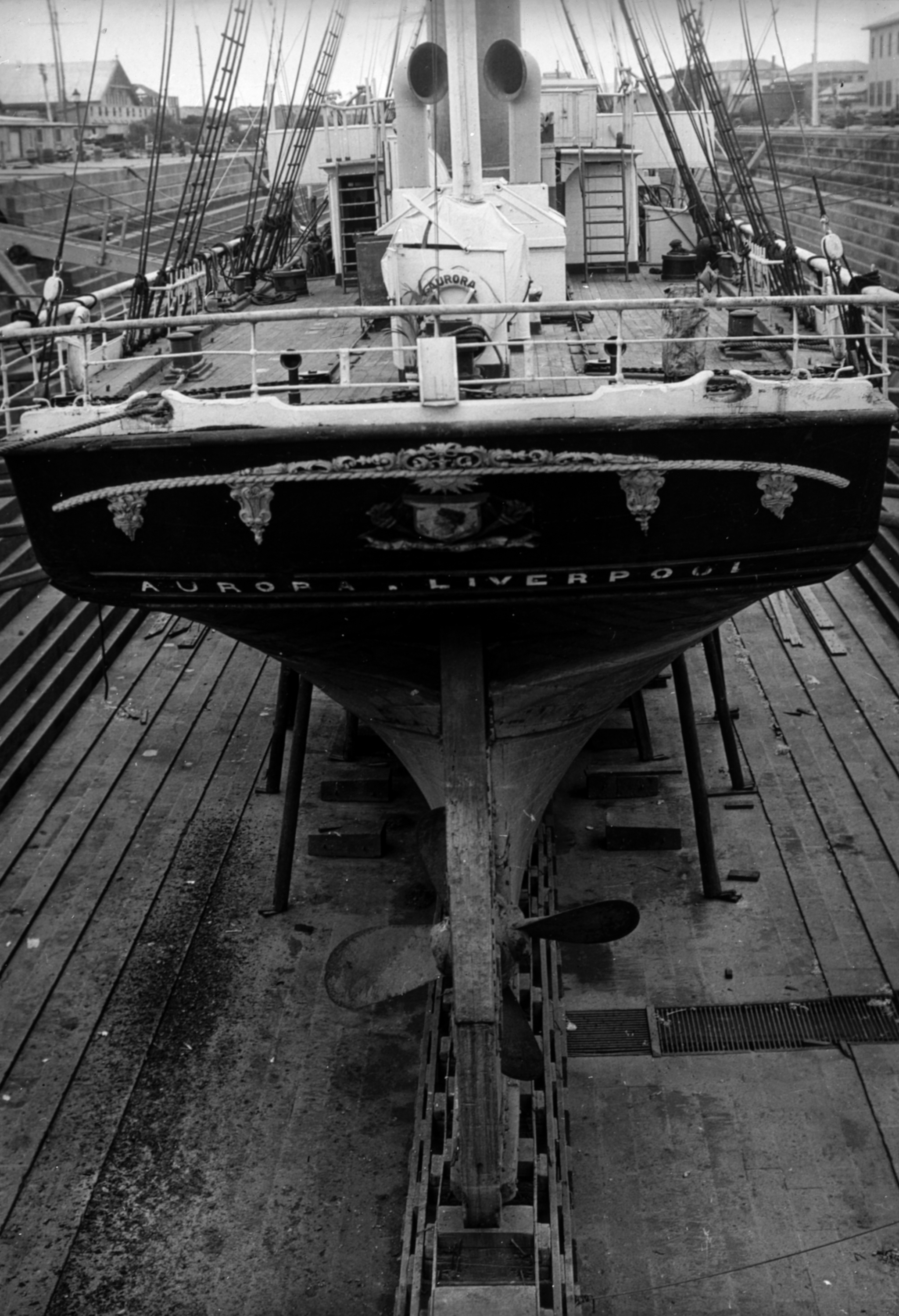 This photo shows the Aurora at drydock.
