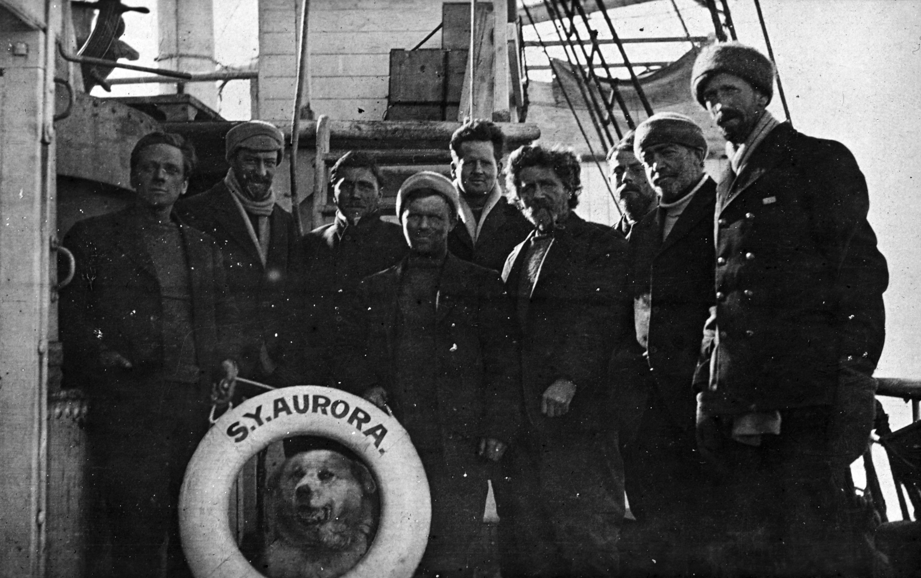 Captain Davis on board the Aurora, with the rescued members of Shackleton's crew who were marooned at Cape Evans.