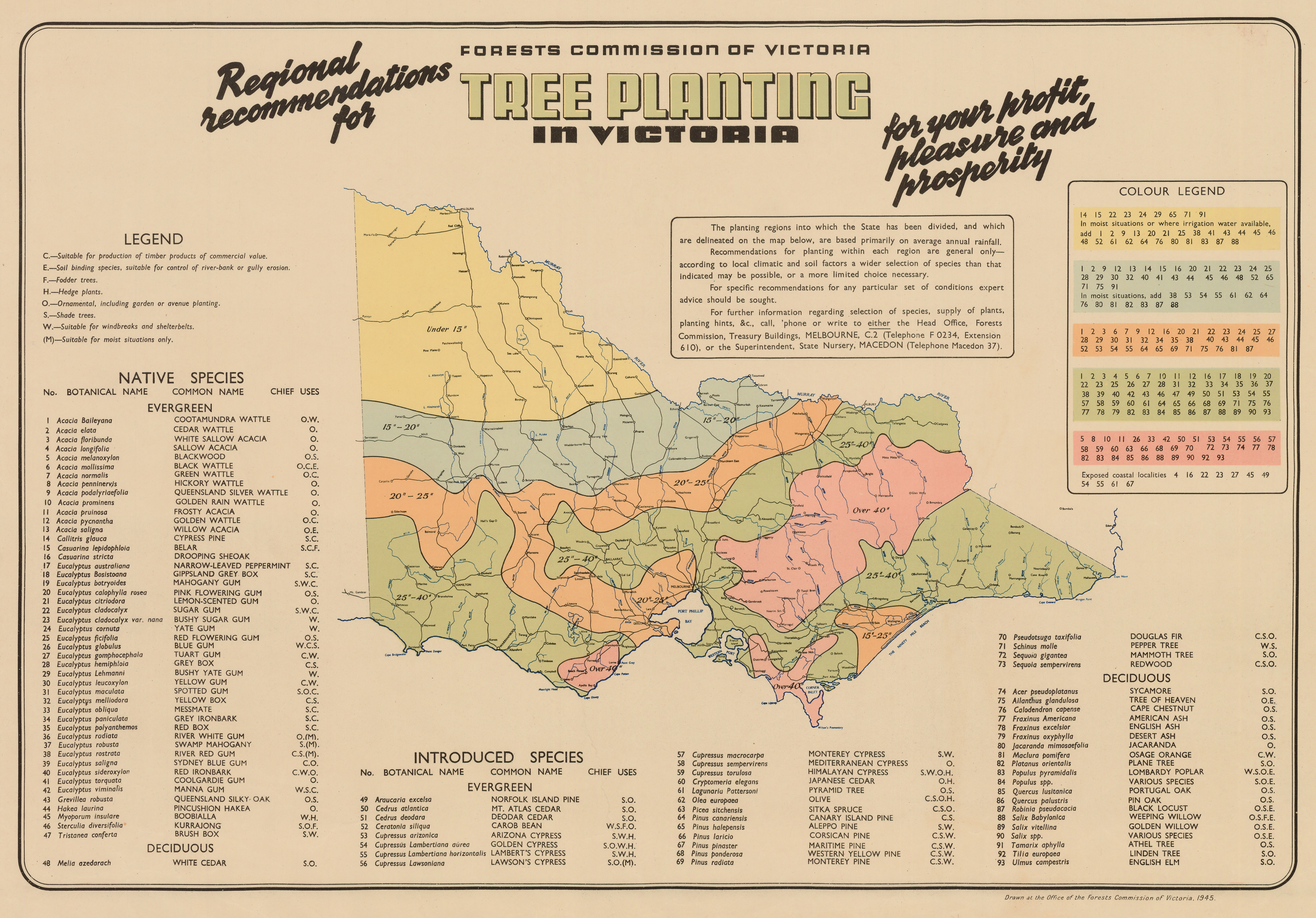 Map of Victoria, showing where particular species of native and introduced trees can successfully grow.