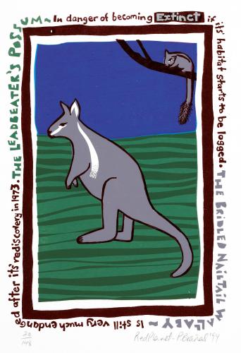 Bridled nailtail wallaby and a leadbeater's possum on a branch in a tree. One of a series commissioned by the RedPlanet Artists in Residence Program, 1994.