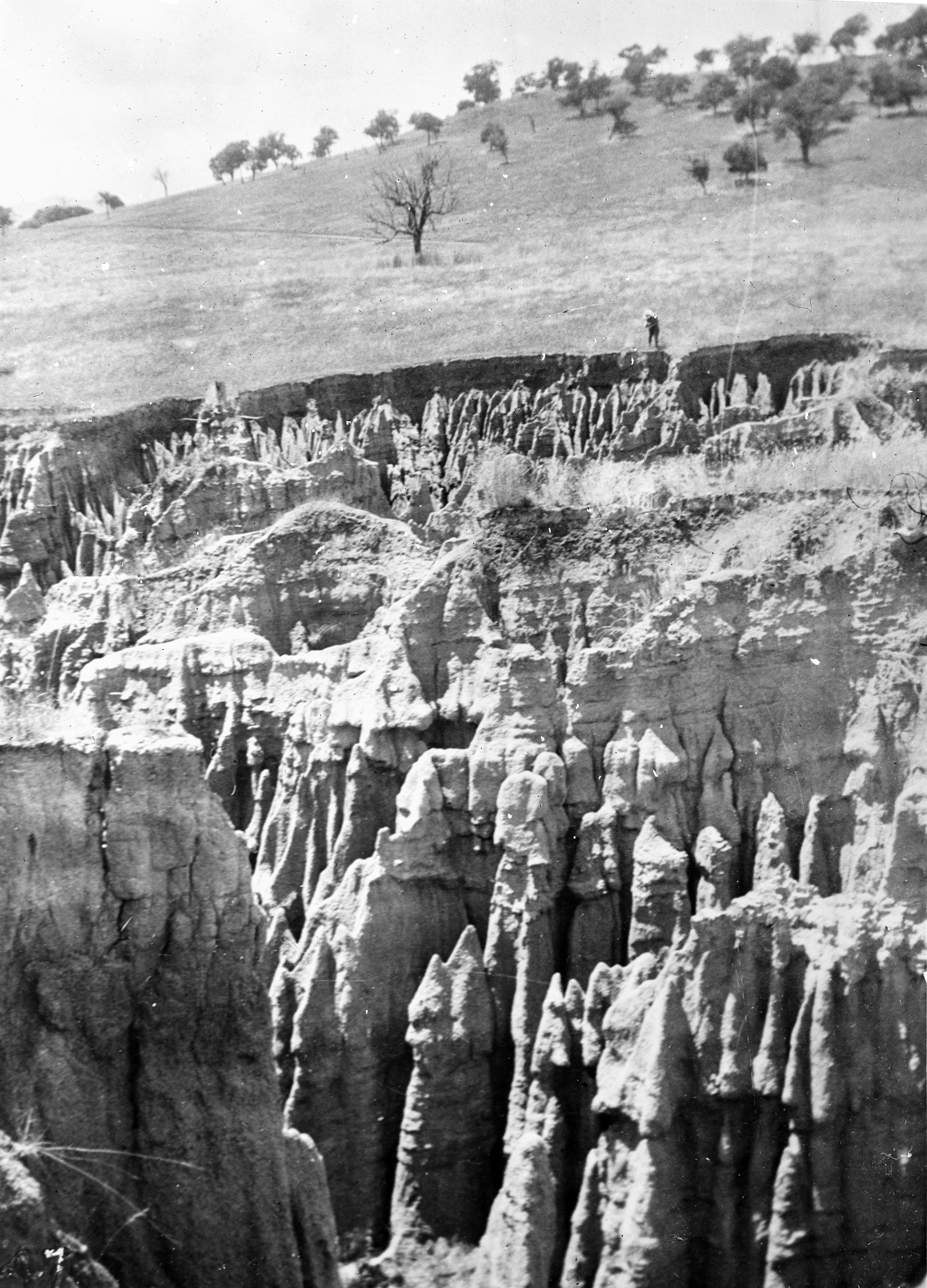 An example of extreme soil erosion in Omeo, Victoria. Note the human figure at the edge for scale.
