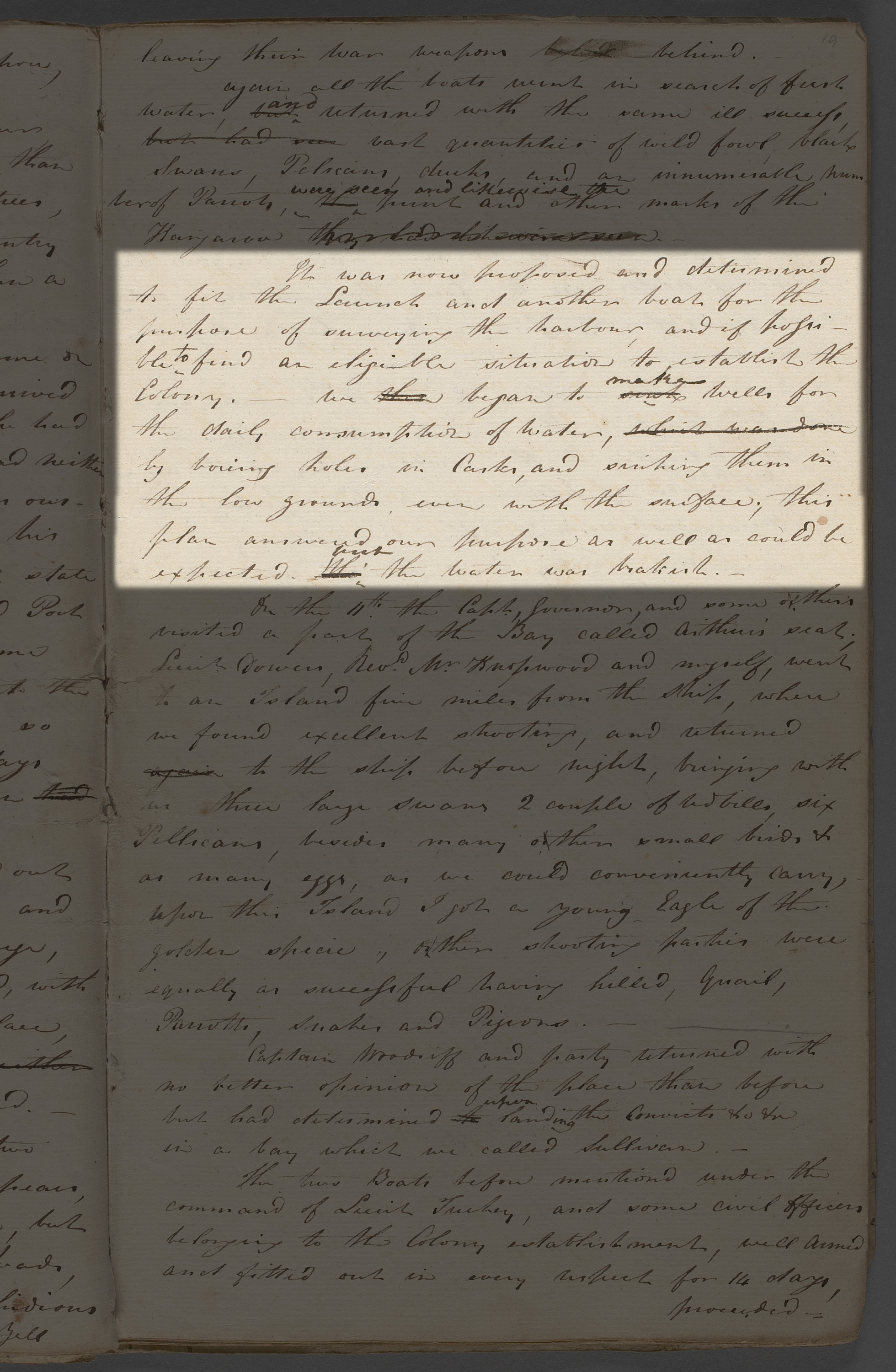 It was now proposed and determined to fit the Launch and another boat for the purpose of surveying the harbour, and if possi-ble to find an eligible situation to establish the Colony. We began to make wells for the daily consumption of water, by boring holes in Casks, and sinking them in the low grounds even with the surface; this plan answered our purpose as well as could be expected but the water was brackish. -