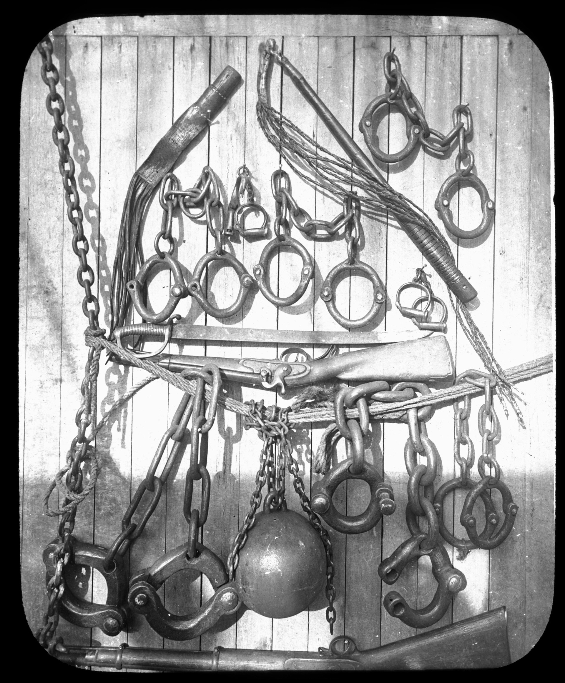 A selection of manacles, chains, whips and irons used to discipline convicts in the 19th century.
