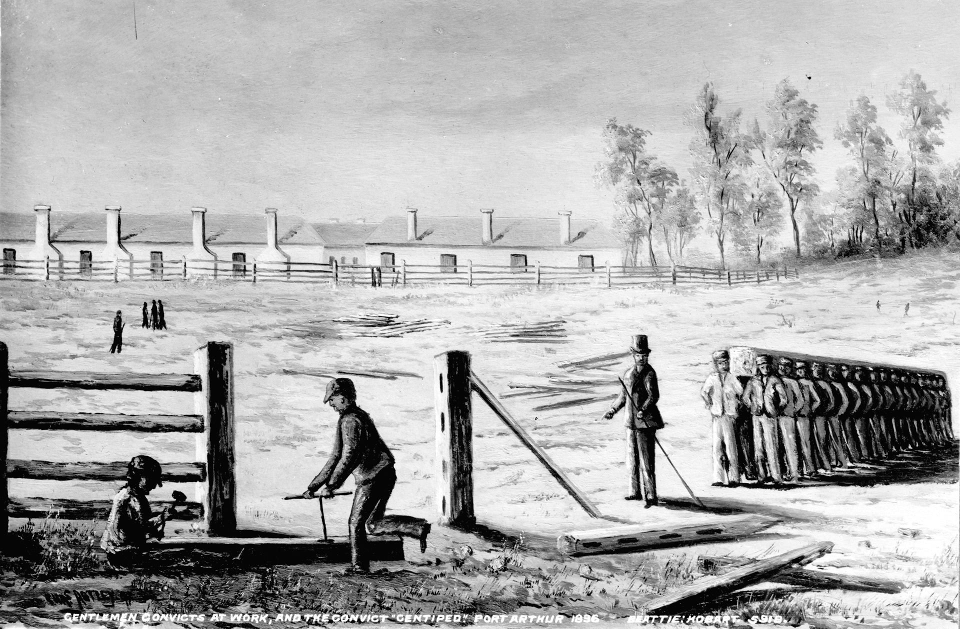 Convicts in Port Arthur carrying a long log on their shoulders during fence construction.