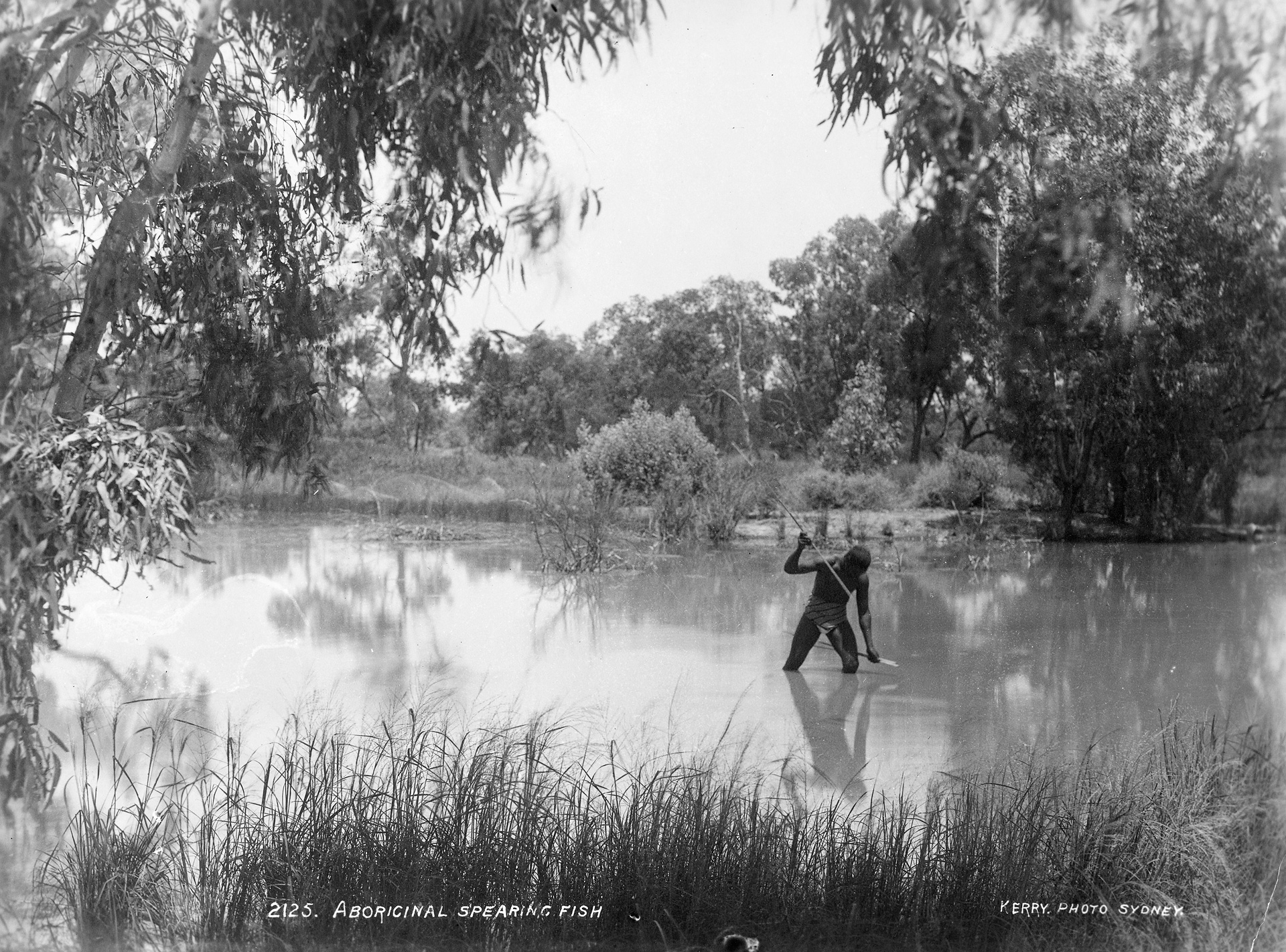 An Aboriginal man spearing fish in a river. This photograph is staged for the camera, and as shuch, should be regarded as saying as much about the photographer and his ideas as it does about the practices of Indigenous people.