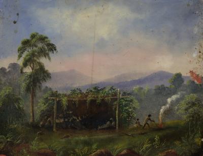 An Aboriginal shelter in the Australian bushland. Although this was painted in Gippsland, Buckley would have been familiar with shelters of this type.