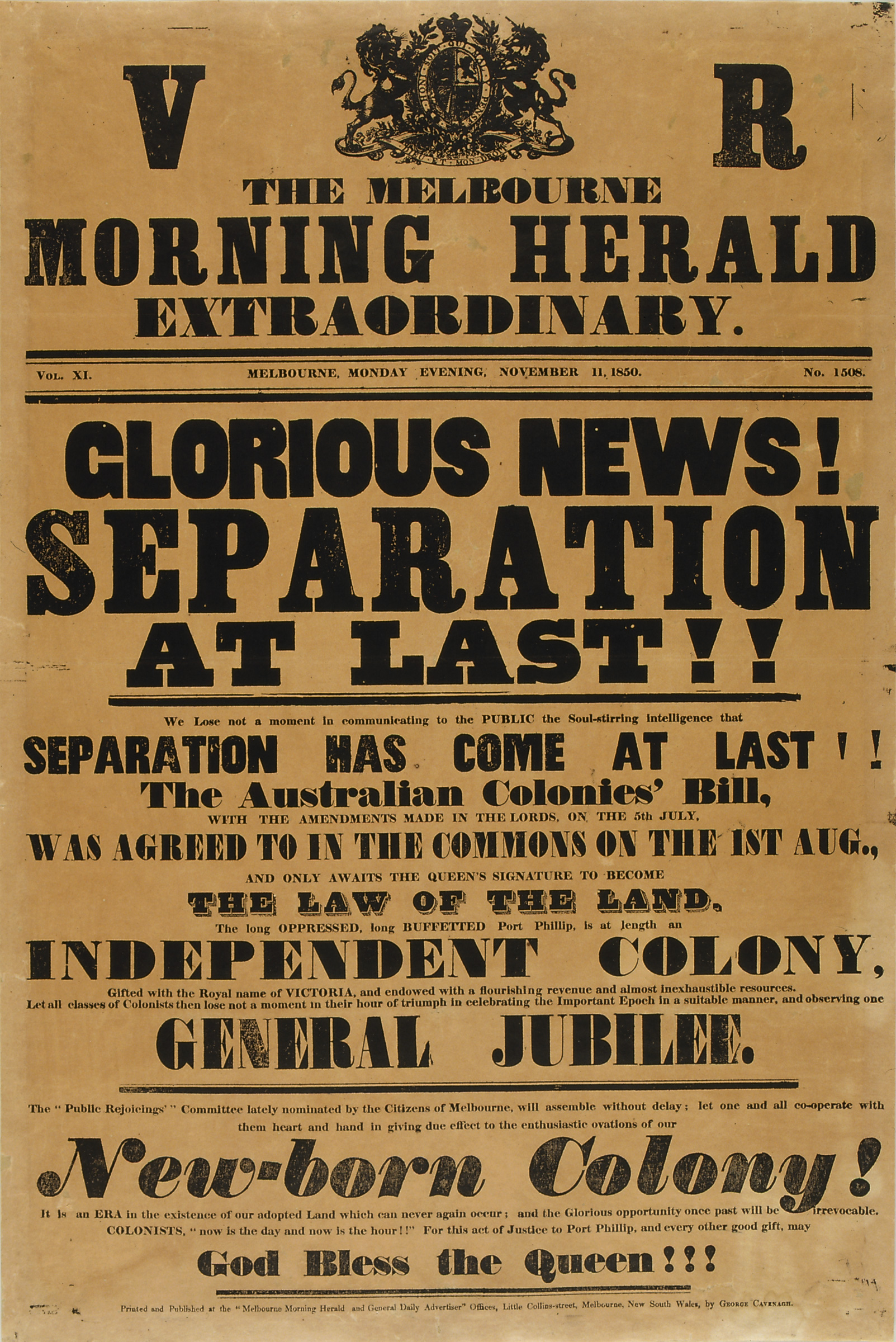 Poster announcing and celebrating Port Phillip's separation, distributed in the Melbourne Morning Herald, 11 November 1850.