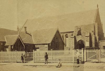 Exterior view of St. Marks church and school buildings, with people waiting on the footpath outside.