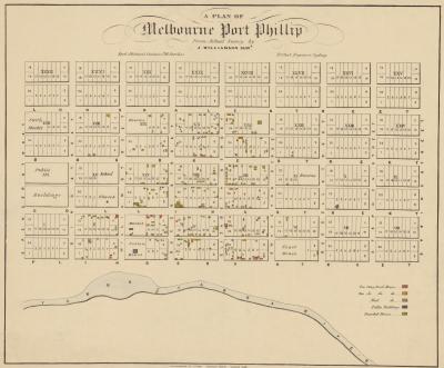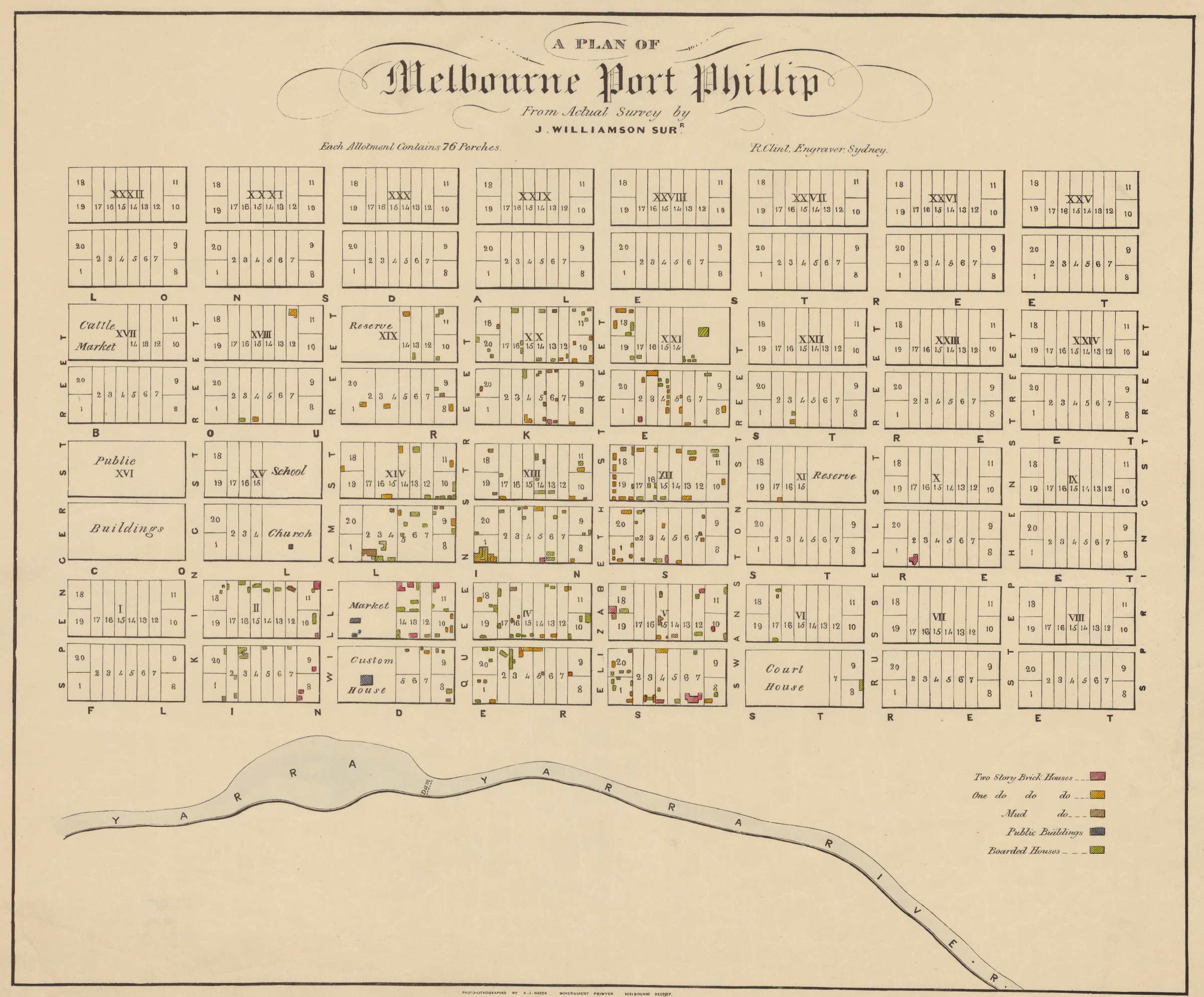 Map of central Melbourne showing location of brick houses, mud buildings, public buildings and boarded houses.