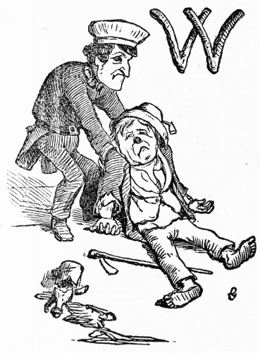 Decorative 'w' with caricature of a policeman picking a drunk man up from the ground.