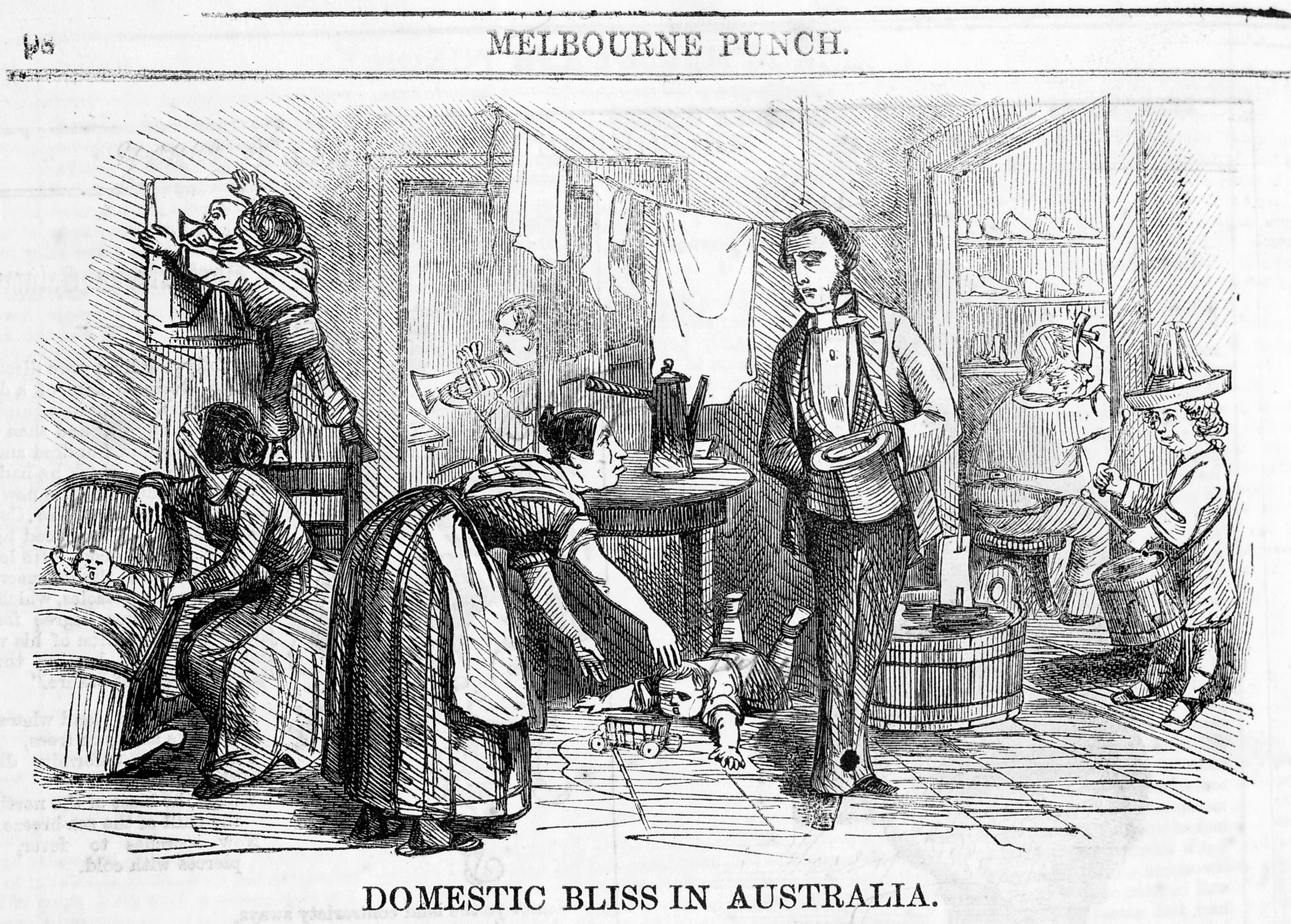 A well dressed gentleman viewing a chaotic scene in a family home.