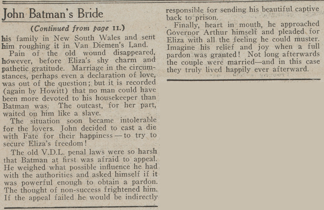 Continuation of magazine story about Eliza Callaghan, John Batman's wife, collected in the Batman Family Papers, 1828-1937.