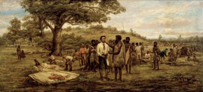 A depiction of Batman's meeting with the Wurundjeri Aborigines at Merri Creek and the alleged signing of Batman's 'treaty'.
