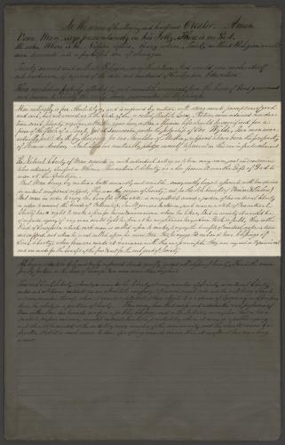 The Natural liberty of Man consists, in each individual acting as to him may seem just and conductive to his interest, Comfort or Whim, This natural liberty as also freewill was the Gift of God to man at the Creation. But Man being by nature both cowardly and sociable, consequently longs to associate with his species for mutual comfort and support, This was the origin of Society, not for the Sole benefit of Princes & Rulers / But man in order to enjoy the benefits of this state is compelled to concede a portion of his natural liberty in order to cement the bonds of Fellowship, I will give one Instance, each man in a state of Free natural liberty has a right to make a fire for his use & convenience where he likes, But in society it would be of infinite injury if any man could light his fire at his neighbours hay or Corn Stack or field, this is the Kind of Concession which each man is called upon to make, to enjoy the benefits of mutual cooperation and support, and when he is not called upon for more than this, he enjoys the real and true blessings of Civil liberty, when laws are made at variance with this one principle they are unjust or Tyrannical and are made for the benefit of the few & not for the real good of Society