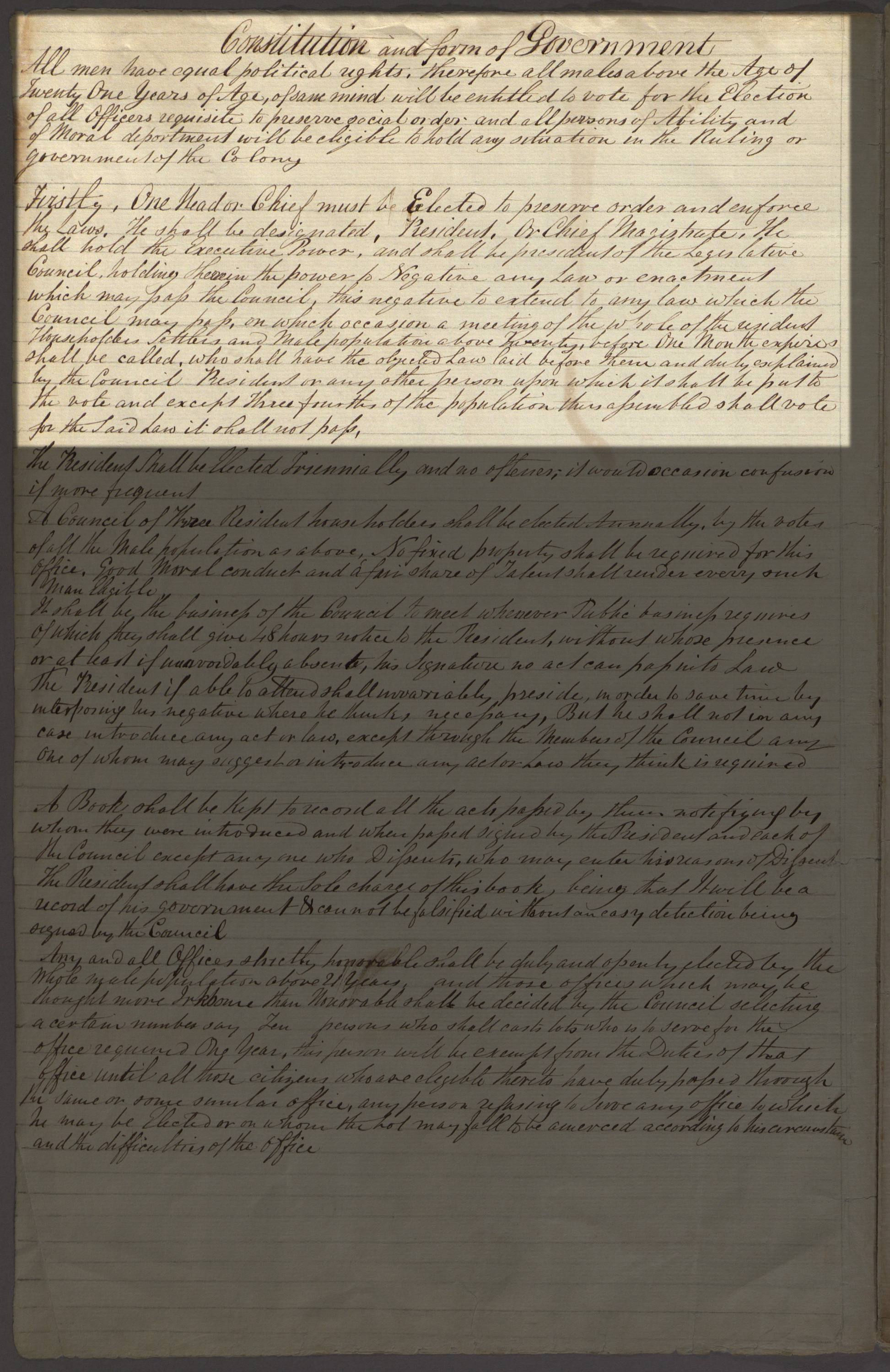 All men have equal political rights, therefore all males above the Age of Twenty One Years of Age, of sane mind will be entitled to vote for the Election of all Officers requisite to preserve social order and all persons of Ability and of Moral deportment will be eligible to hold any situation in the Ruling or government of the Colony