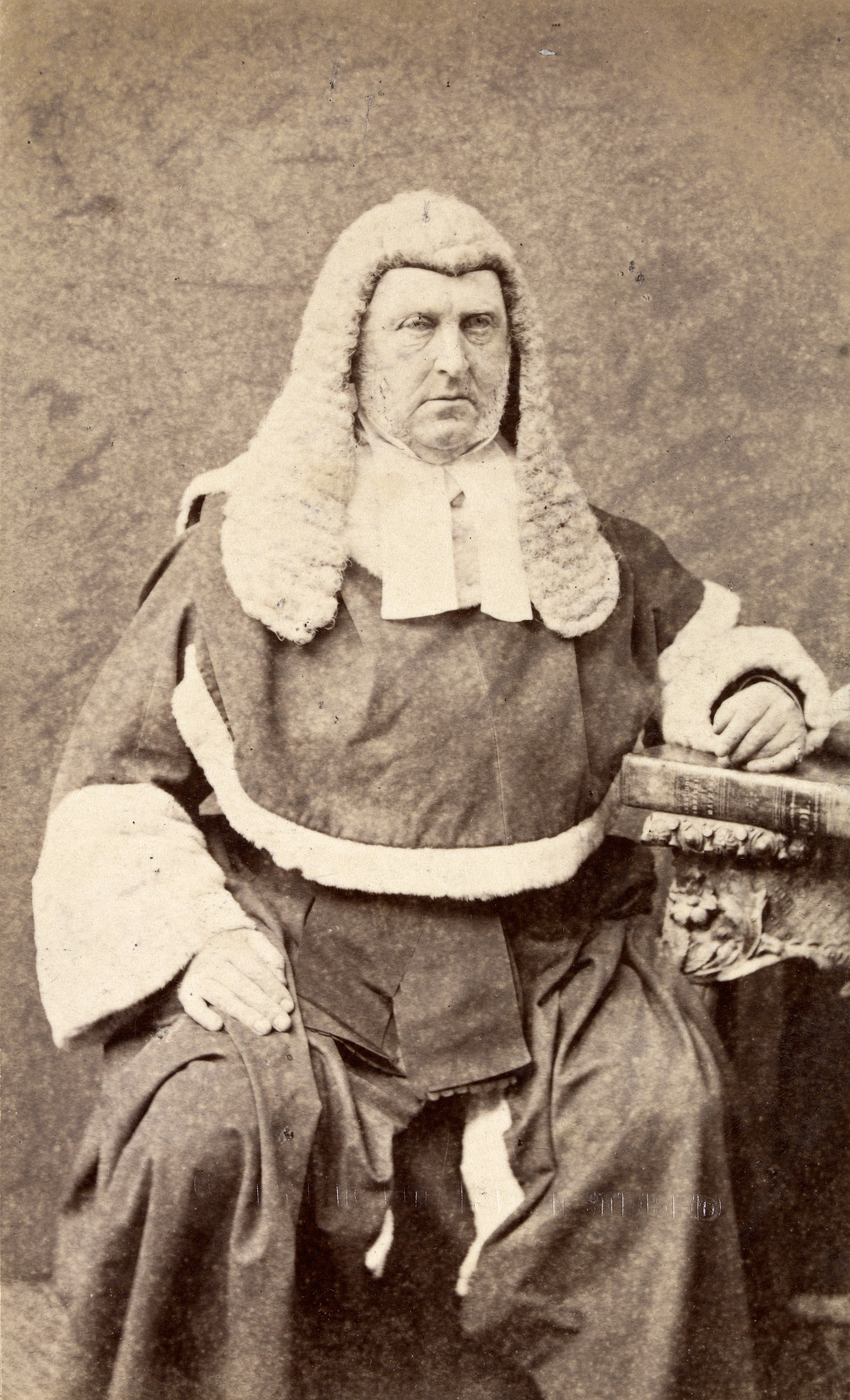 Portrait photograph of Redmond Barry wearing judge's wig and robes.