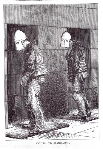 Two prisoners wearing hoods with slits for eyes, waiting to be examined. An illustration published in The Australasian Sketcher.