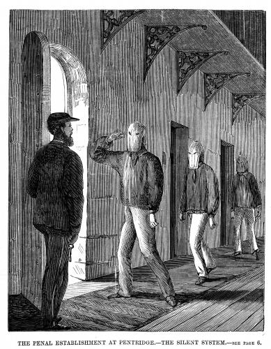 Prisoners in Pentridge Prison wearing hoods with slits cut out for eyes, as punishment.