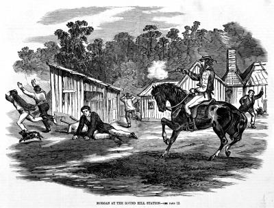 Morgan on a horse confronting residents at the Round Hill Station, Victoria.