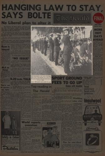 Photograph showing police standing holding back the crowd standing vigil outside Pentridge Prison while Ronald Ryan was hanged.