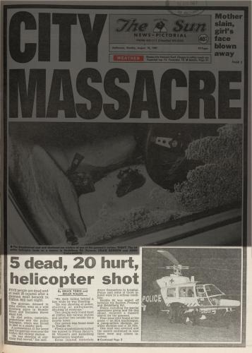By Bruce Tobin and Brian Walsh. Photograph by Craig Borrow. The Sun, 10 August 1987, p1.