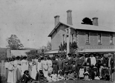 A group of Aborigines in Eurpean dress outside the Coranderrk mission. William Barak is in the centre of the photo, and Superintendent Joseph Shaw stands at the far right.